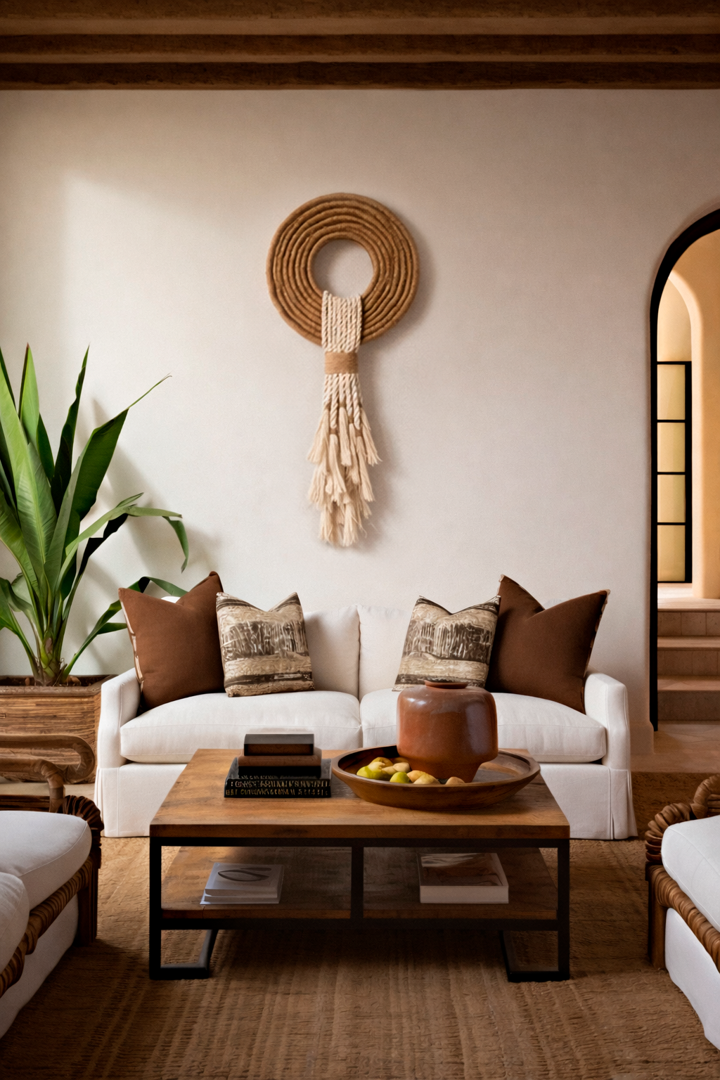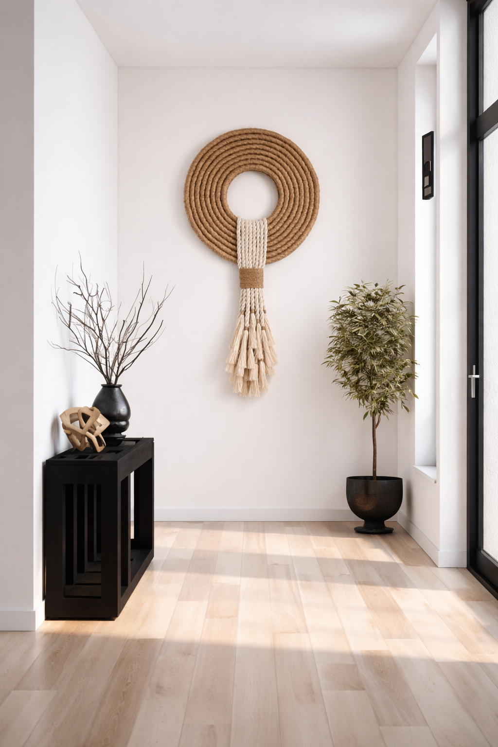 A forma circular de juta representa continuidade e conexão, enquanto as franjas de algodão em cascata evocam fluidez e harmonia orgânica.