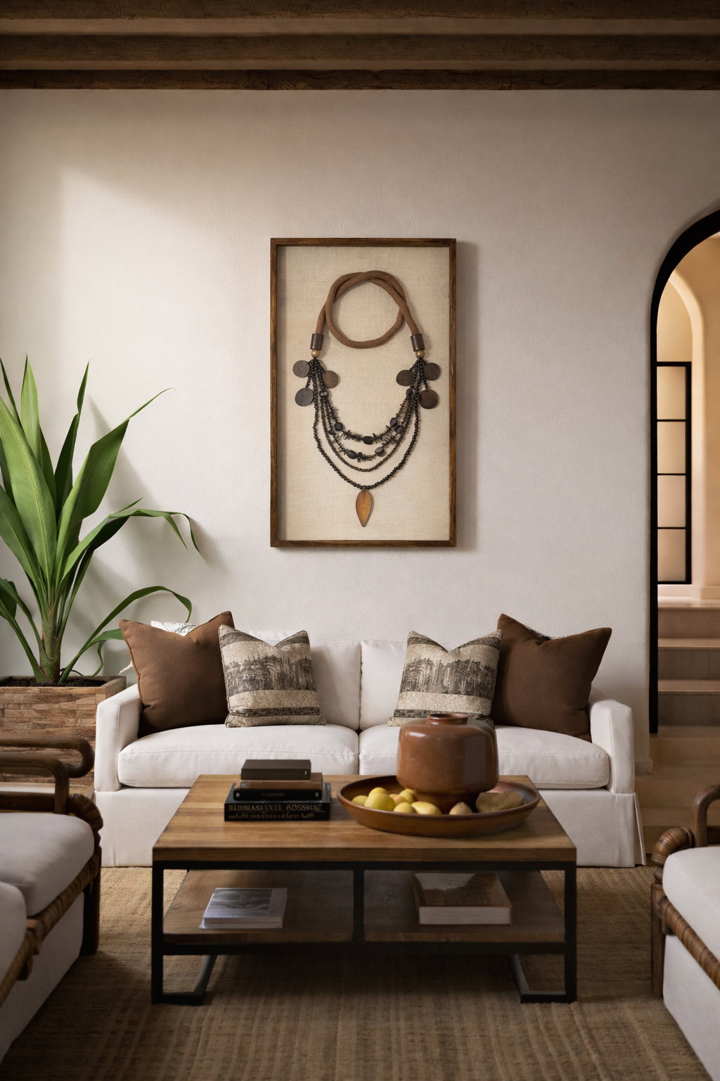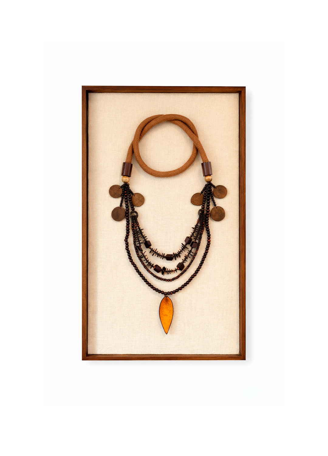 Esta obra de arte simboliza a essência dos ornamentos tribais, com sua memória ancestral. As camadas de contas e elementos naturais conferem a esta peça personalidade, conectando tradições passadas com a harmonia presente.