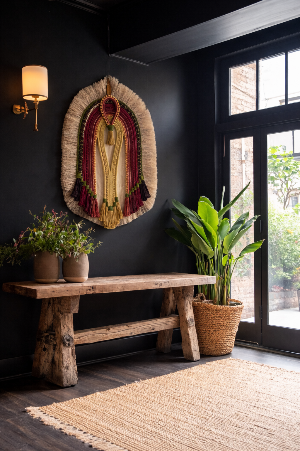 Technique: macrame, wrapped threads, fiber art, tribal weaving
