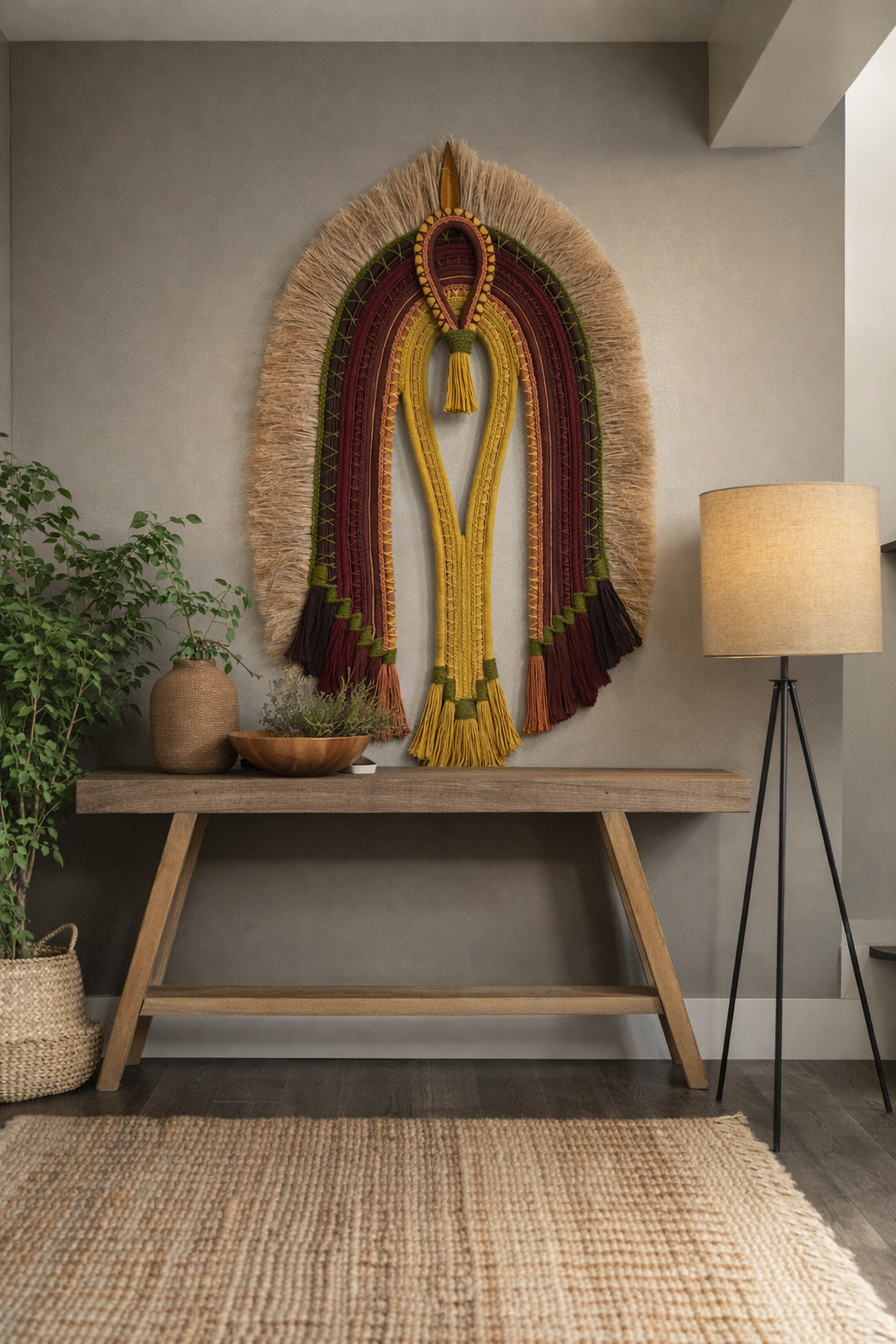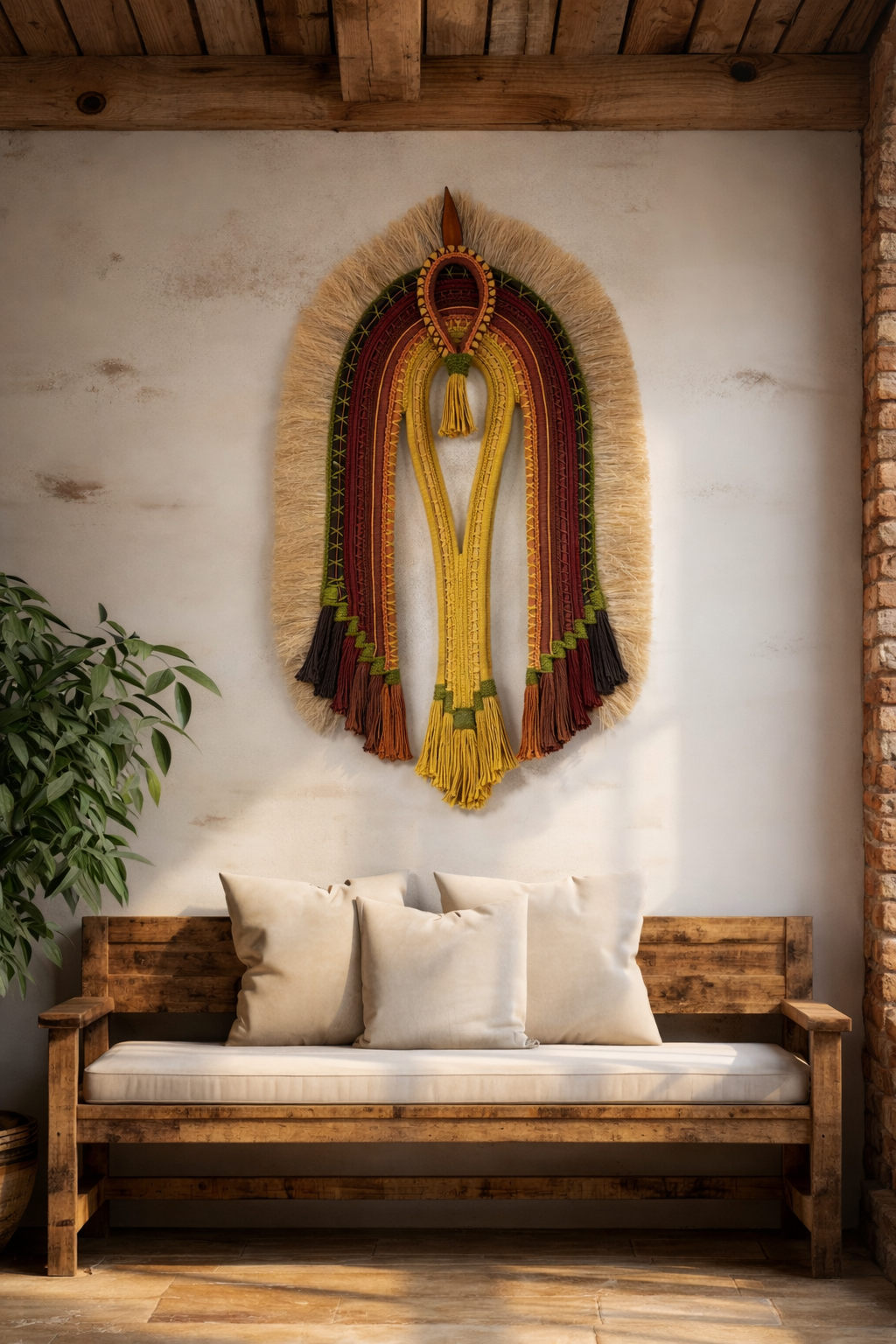 The artwork symbolizes Autumn — the time of detachment, introspection, and silent transformation. With its ceremonial headdress form, it acts as an Autumn Portal, connecting what has been to what is to come. The warm palette in shades of ochre, orange, dark red, burgundy, brown, green, and natural raffia represents falling leaves and the wisdom of letting go to allow for new beginnings.